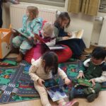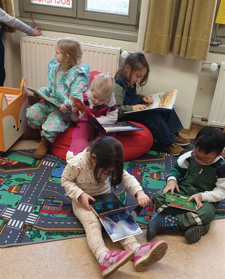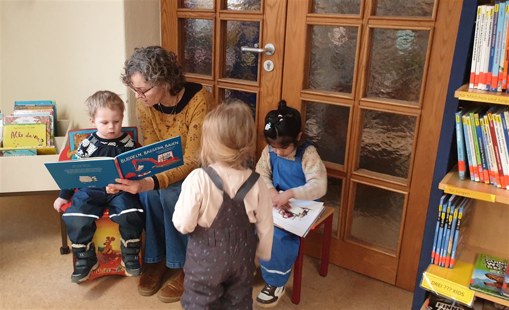 Regelmäßig besuchen wir mit den Kindern die Pfarrbücherei. Dort werden ihnen verschieden Bücher vorgestellt, außerdem können die Kinder sich selbstständig Bücher aussuchen und anschauen. Dieser Besuch fördert nicht nur die Leselust, sondern bringt den Kindern Freude am Entdecken und Ausleihen der Bücher.