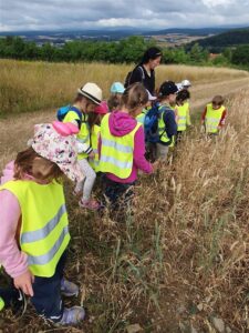 Mittwoch sind einige Kinder am Erlebnistag mit dem dem Bus nach Herschfeld in den Wald gefahren. Dort haben wir an einem Feld geschaut und gefühlt was hier wächst – Getreide. Danach haben wir am Waldsofa gefrühstückt und sind anschließend spielen gegangen. wurde Besonders gefallen hat den Kindern die Hängematte, in die sie sich hinein legen konnten und dabei leise Geschichten hören konnten.