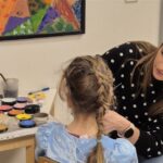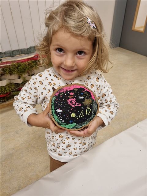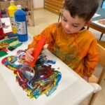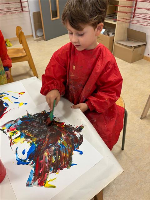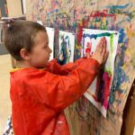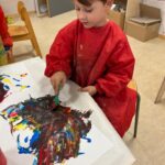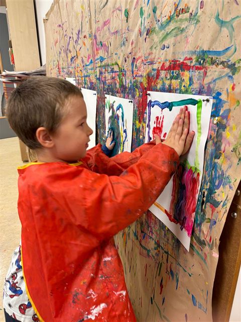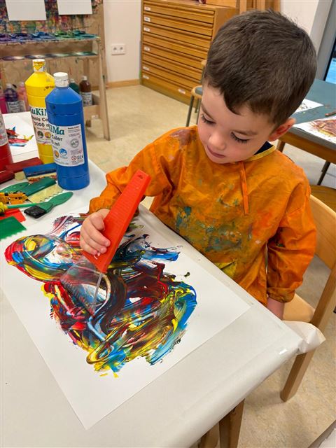 Die Kinder probieren verschiedene Farben auf verschiedenen Materialien aus.