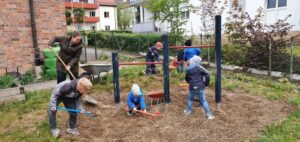 Freitag, 8.Mai: die Kinder helfen fleißig beim Aufstapeln der Pflastersteine und der Bagger gräbt die Baugrube
