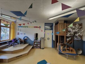 Es soll aber auch Raum zum Begegnen für Eltern bieten. Durch eine mobile Trennwand können hier große Veranstaltungen z.B. Elternabende sattfinden.