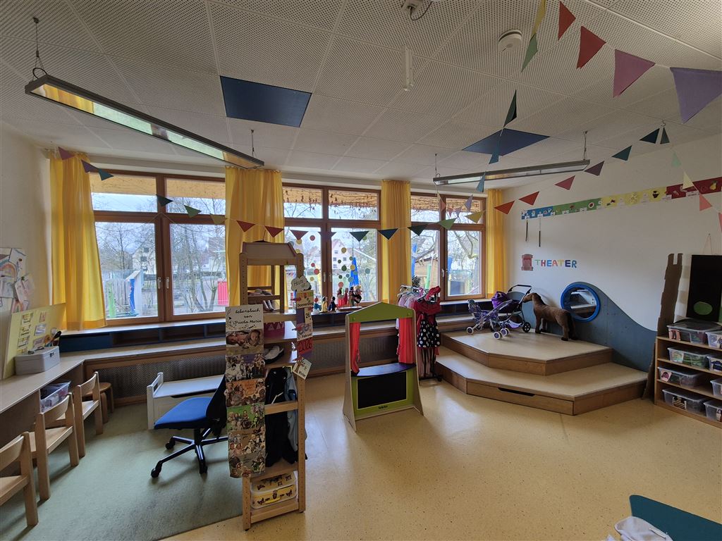 Unser Haus mit seiner Ausstattung und der Außenspielfläche bietet drei Kindergartengruppen (3-6 Jahre) und zwei Krippengruppen (1-3 Jahre) Raum zum Spielen und Entfaltung. Alle Räume sind nach den Bedürfnissen der Kinder ausgestattet. Die Kinder sollen ihrem Alter und vor allem ihrer Entwicklung entsprechend Möglichkeiten finden, zu spielen und zu lernen. Sie finden in Material und Ausstattung Herausforderungen, die sie weder über – noch unterfordern.